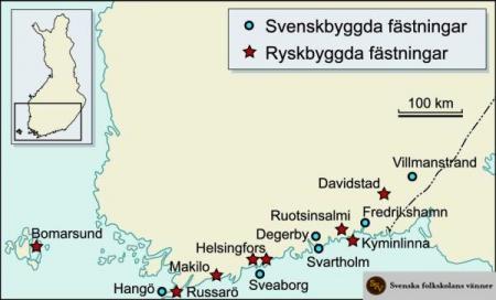 Finlands östgräns och sydkust har under gångna tider spärrats av fasta försvarsanläggningar, byggda av både vän och fiende. Karta: Steffen Ørsted.