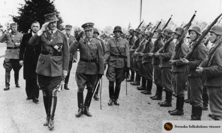 Marskalk Mannerheim granskar hederskompaniet efter sitt tillträde som president 4/8 1944. Fortsättningskrigets avslutande år var en svår balansgång för den finländska stasledningen: det gällde att invänta det ögonblick då Tyskland var för svagt för att kunna förhindra Finlands utträde ur kriget och Sovjetunionen ännu inte tillräckligt starkt för att krossa allt motstånd. Foto: Schildts bildarkiv.