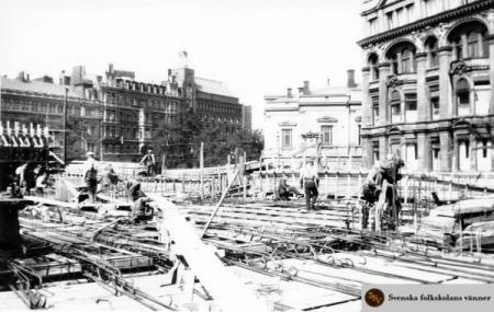 Stockmanns varuhus under uppbyggnad. I bakgrunden syns bl.a. Gamla studenthuset. Att varuhuset var ett utpräglat betongbygge vittnar de många armeringsjärnen om. Foto: Privat samling.